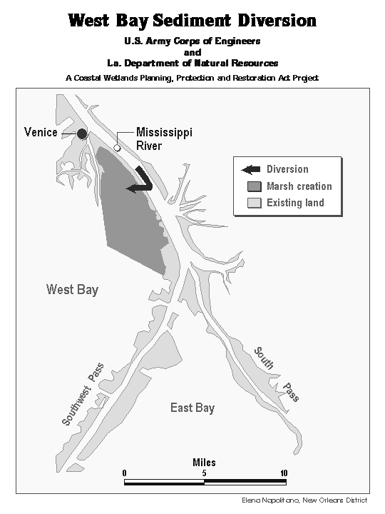 The project will thrust river water and sediment into West Bay, which is now a shallow arm of the Gulf of Mexico, the wetlands having been lost to coastal erosion. The project will be done in two phases: