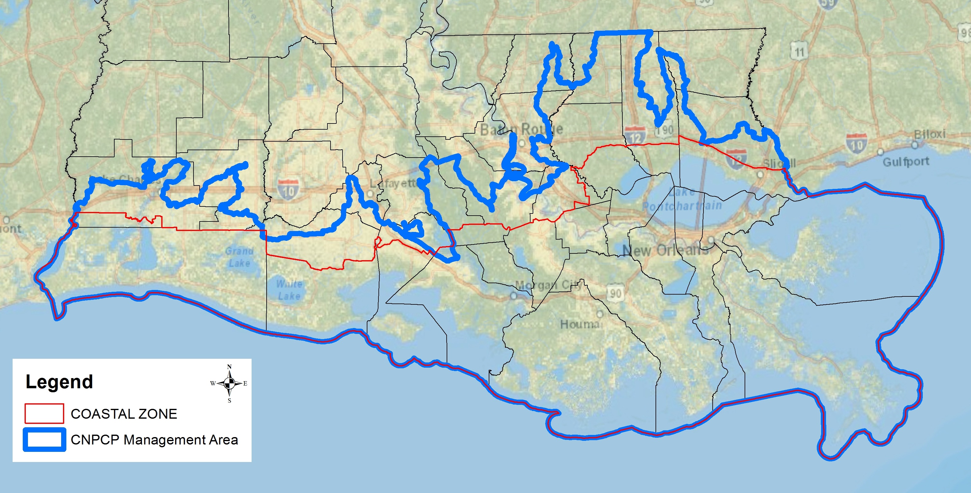 The Coastal Nonpoint Pollution Control Program (CNPCP) is being developed, in partnership with the Louisiana Department of Environmental Quality (LDEQ) and other governmental and non-governmental agencies, to educate Louisiana coastal users about available best management measures, and to reduce pollutants that may impact the coastal waters of Louisiana. Map of the coastal nonpoint area.