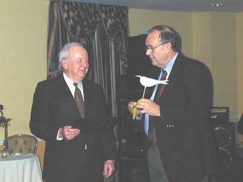 PHOTO: Secretary Caldwell was honored with a wooden tern decoy and plaque during ceremonies held at the Le Pavillon on December 4, 2000. CSO past chariman Eldon Hout of the Oregon Department of Land Conservation and Development presented the award.