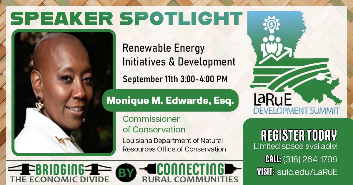 Commissioner of Conservation Monique Edwards will be speaking about the future of renewable energy as a panelist at the Louisiana Rural Economic Development Summit being held at the Paragon Casino Resort Sunday, September 10 – Tuesday, September 12, 2023