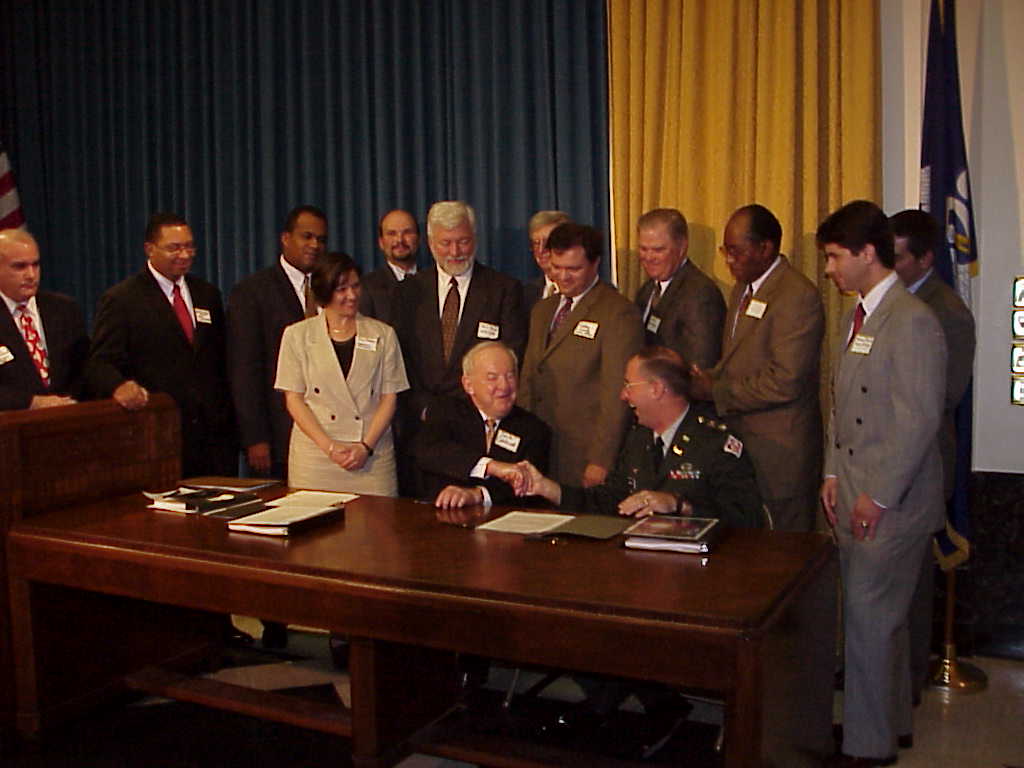 The New Orleans District, U.S. Army Corps of Engineers and the Louisiana Department of Natural Resources today held an historic signing ceremony in Baton Rouge to launch a major coastal wetlands study. With the signing of the Coast 2050 Feasibility Cost Share agreement, the agencies this month will initiate a $6 million feasibility study of the Barataria Basin. New Orleans District Engineer Col. Thomas Julich and DNR Secretary Jack Caldwell signed the cost share agreement to fund the study which requires that each agency provide about $3 million over the next two years. “This is potentially the largest and most ambitious effort to date by the Corps of Engineers as it relates to coastal restoration,” said Julich. “We can relate this to the massive effort to build the Mississippi River and Tributaries Project after the 1927 flood.” Caldwell said the basin study will lay the foundation for pursuing funding sources other than the Breaux Act. “We will be preparing ready-to-go projects so that we can take advantage of potential funding sources such as the Water Resources Development Act and possibly CARA monies (offshore oil and gas royalty revenues) if current federal legislation passes this year,” Caldwell said. The Barataria Basin was selected as the first area for study and action because it is the most critical, losing about 11 square miles annually. Engineering and environmental analyses from the study are expected to yield a basis for construction of viable projects. The study will focus on marsh creation, barrier island restoration and river diversion strategies. When completed, the study could result in restoration projects totaling as much as $3.5 billion within that highly impacted coastal basin. Other coastal feasibility studies are planned in the future. Since 1991, coastal restoration projects to restore and protect the state’s fragile coast have been accomplished through the Coastal Wetlands Planning, Protection and Restoration Act (or the Breaux Act). These projects and other initiatives such as the Barataria-Terrebonne National Estuary Program have increased local and national environmental awareness of the state’s coastal land losses. Over the years, Breaux Act funding to Louisiana has amounted to nearly $40 million annually. Federal and state officials overseeing the effort estimate that an additional $14 billion in funding will be needed to fully implement the Coast 2050 strategy designed to restore a collapsing coastal ecosystem. Coast 2050 goals emphasize ecosystem-wide approaches to sustaining coastal Louisiana. The signing took place in the Governor’s Press Conference Room at the State Capitol. Coastal officials from across the state, legislators, environmentalists and activists attended the ceremony. |