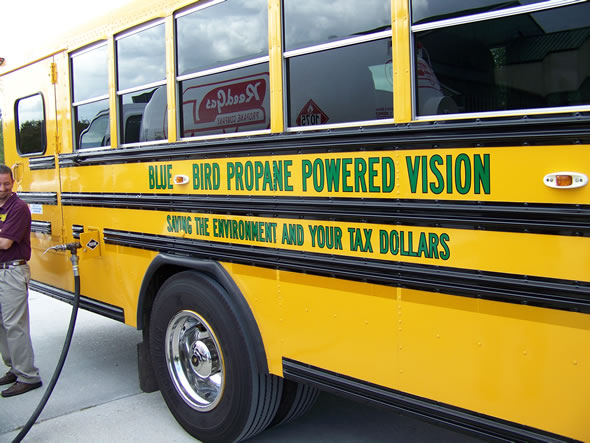 Propane, known as LPG (liquefied petroleum gas), is used by many fleets, allowing propane fueled vehicles excellent driving range and costing about $1.50 a gallon less than gasoline. The Blue Bird Corporation began in 1927, and today offers and manufactures the propane powered bus as part of its Alternative Fuels Strategy in the U.S.