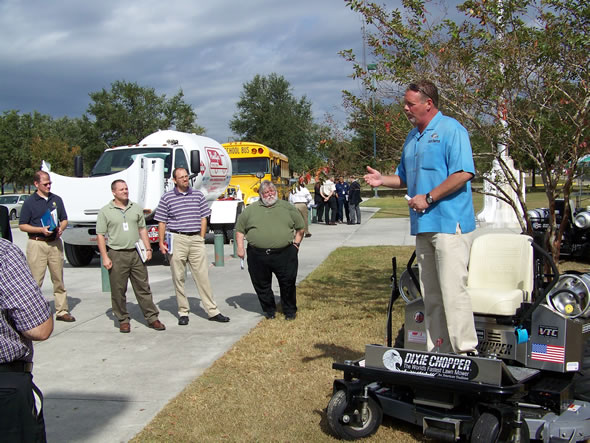 Matt Land of the Dixie Chopper company speaks to crowd about this lawn-mower powered by propane gas.