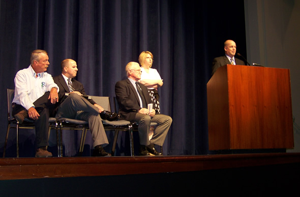 L to R: Carl Corley and Albert Burleigh of Blue Bird Corporation, Mike McClung, former School Transportation Director from San Antonio, Texas; Tammy Morgan of the Greater BR Clean Cities Coalition, and David Reed of the La. Propane Gas Association give presentations to participants at the tour sponsored in part by DNR Technology Assessment Division and Energy Office.