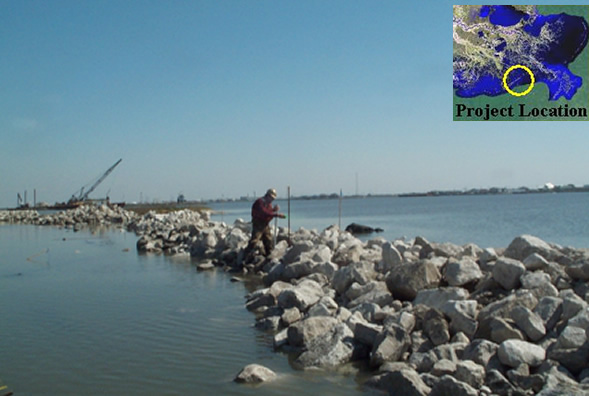 A Bertucci Construction Company worker checks for proper elevation of rip rap required for this shore protection project. According to DNR Contract Manager John Hodnett, the project includes 5,500 linear ft. of stone. On March 1, 2004, the public and state and local government officials will visit the project for dedication ceremonies hosted by Grand Isle Mayor David Camardelle.