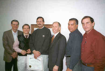 Larres shown with Office of Conservation leadership. Director of Injection and Mining Carroll Wascom, Assistant Commissioner of Conservation Jim Welsh, Engineer Ulf Larres, Commissioner of Conservation Philip N. Asprodites, Asst. Director Joe Ball, and Petroleum Engineer Doyle Johnson.
