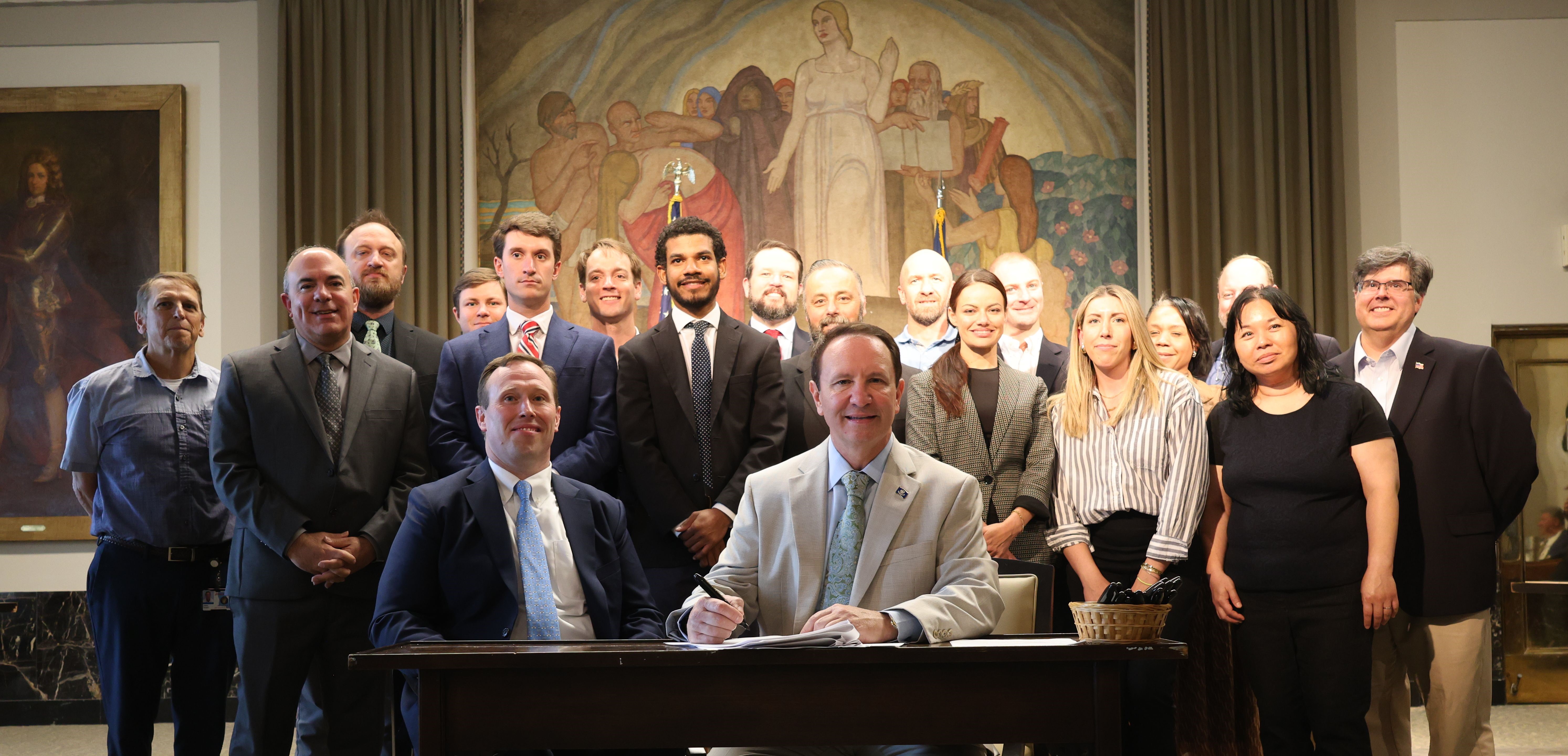 Gov. Jeff Landry on Wednesday signed Senate Bill 65 into law, re-creating the Department of Energy and Natural Resources for another four years, joined by DENR Secretary Tyler Gray and members of the DENR staff.