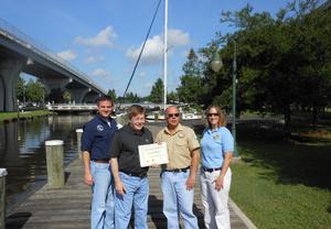 Photo ID: Director of the Terrebonne Office of Coastal Restoration & Preservation Nicholas Matherne and Terrebonne Parish President Michel H. Claudet receiving the Louisiana Clean Marina certificates from Jon Truxillo, DNR Coastal Resources Scientist and Sara Krupa, DNR Coastal Scientist Supervisor on June 20, 2014.