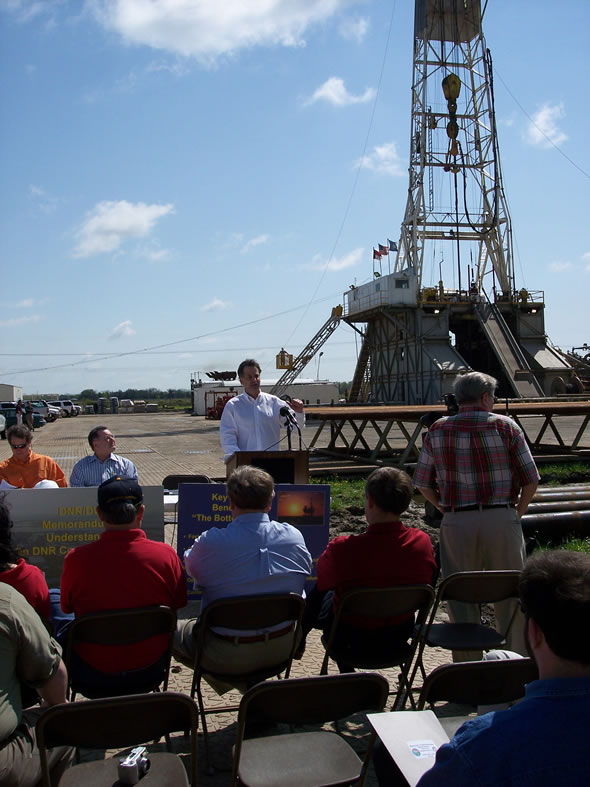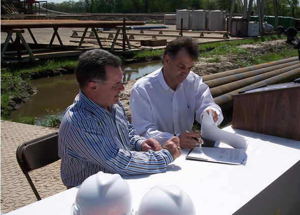An active oilfield drilling location in Scott, LA served as the backdrop today for a signing event between the state departments of Natural Resources and Wildlife and Fisheries to announce new procedures that streamline the coastal use permitting process. A new Memorandum of Understanding (MOU) was signed while visiting a well site at Scott field in Lafayette Parish where drilling for natural gas was underway. The secretaries of the Louisiana Departments of Natural Resources (DNR) and Wildlife and Fisheries (DWF) invited members of the oil industry to also participate in the event. This agreement between agencies will significantly reduce processing delays for oil and gas companies seeking coastal use permits in areas within the coastal zone. At this particular site, the oil and gas drilling operation was permitted under the rules and regulations of DNR’s Office of Conservation’s Order 29-B by Tri-C Resources, Inc. of Houston, Texas. Tri-C Resources has also worked within the state’s coastal zone, having been granted eight coastal use permits since 1998. Over 60 percent of the coastal use permits issued by DNR’s Coastal Management Division are for oil and gas related activities. DNR Secretary Scott Angelle said that with the MOU plus other efficiency measures undertaken by the division, there has been a reduction in oil and gas permit processing by about 30 days. “We are now more involved in the pre-application process which prepares applicants to have many details taken care of in advance,” said DWF Secretary Dwight Landreneau. “Applicants can take steps early on to make sure their permit requests are in compliance with existing regulations and eliminate time delays created when paperwork had to be resubmitted.” |